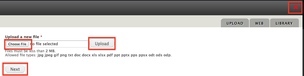 Click "Choose File" and browse to where your image file is located, then click "Upload," then "Next." To cancel, click the "X" in the upper right corner of the window: