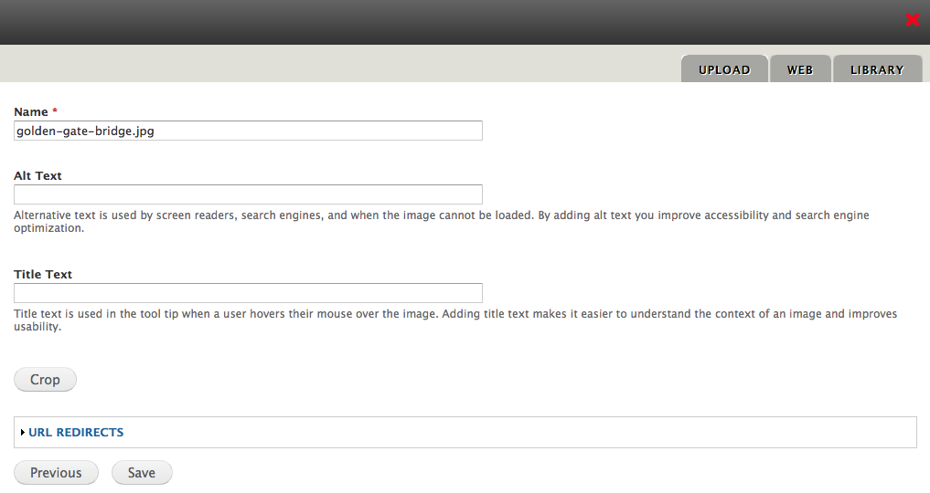Hit "Save" once you've finished adding your alt and title text. You will also have the option to crop your image by clicking the "Crop" button. Click "Save" when you're done.