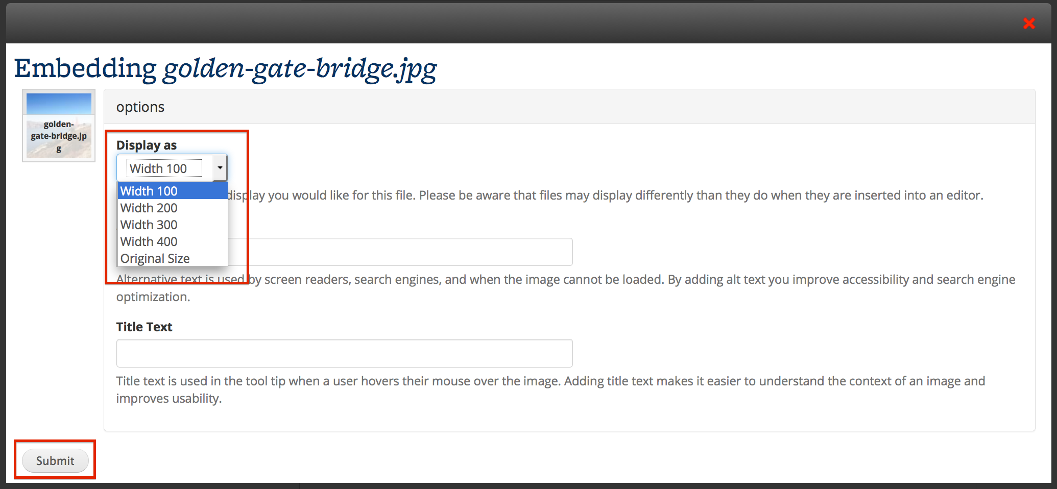 You will then be prompted to change the name of your image if desired (otherwise, just leave as is), as well as add alt and title text for your image.