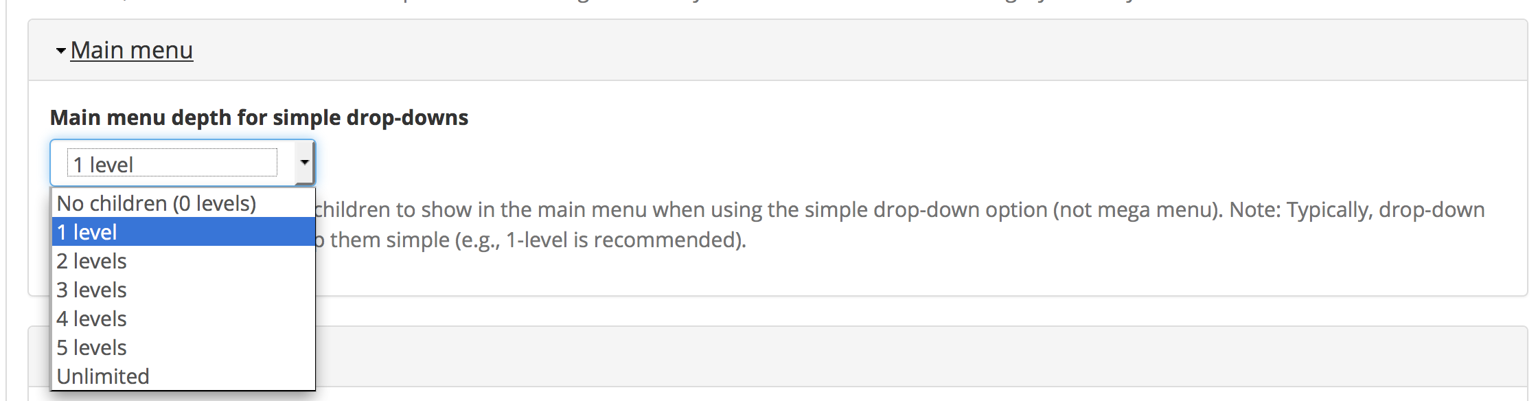By default, the drop-down menu will display only 1 child (the first level of sub-menu). From a general usability standpoint, it can be considered overwhelming for a drop-down menu to display more than 1 child level at a time. If you would like to display additional sub-menu levels, you can change those settings from your Site Builder dashboard (from the "Theme Settings" in "Other Administration"). Under "Main Menu," you can select additional menu levels. See Figure 5, below.