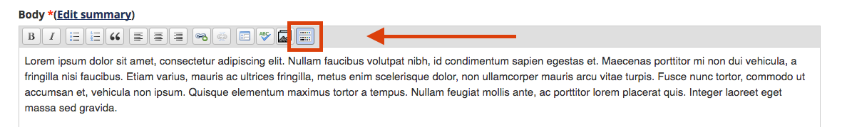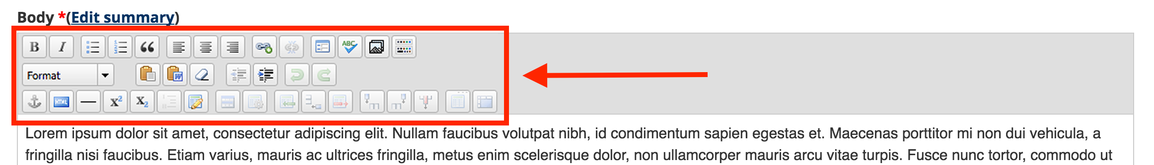 When you create a Content Page, News item, or FAQ item, and if you are a Site Builder creating certain widgets, you will notice an editing toolbar within the "Body" section: