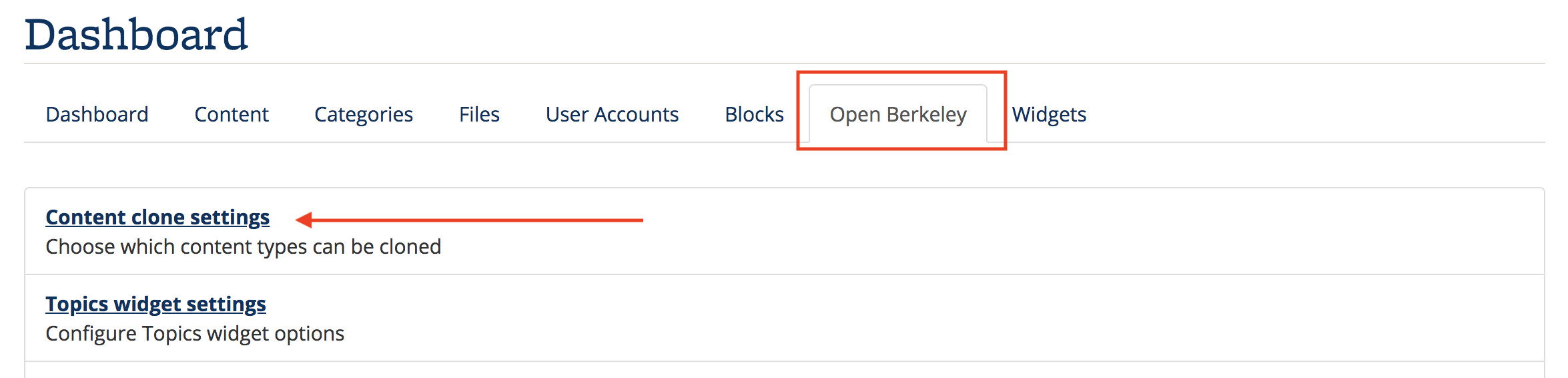 In the admin menu, visit the Site Builder dashboard, then select the "Open Berkeley" tab. Click the "Content clone settings" link. Check the checkbox for each content type for which you want to allow cloning, and then click "Save."