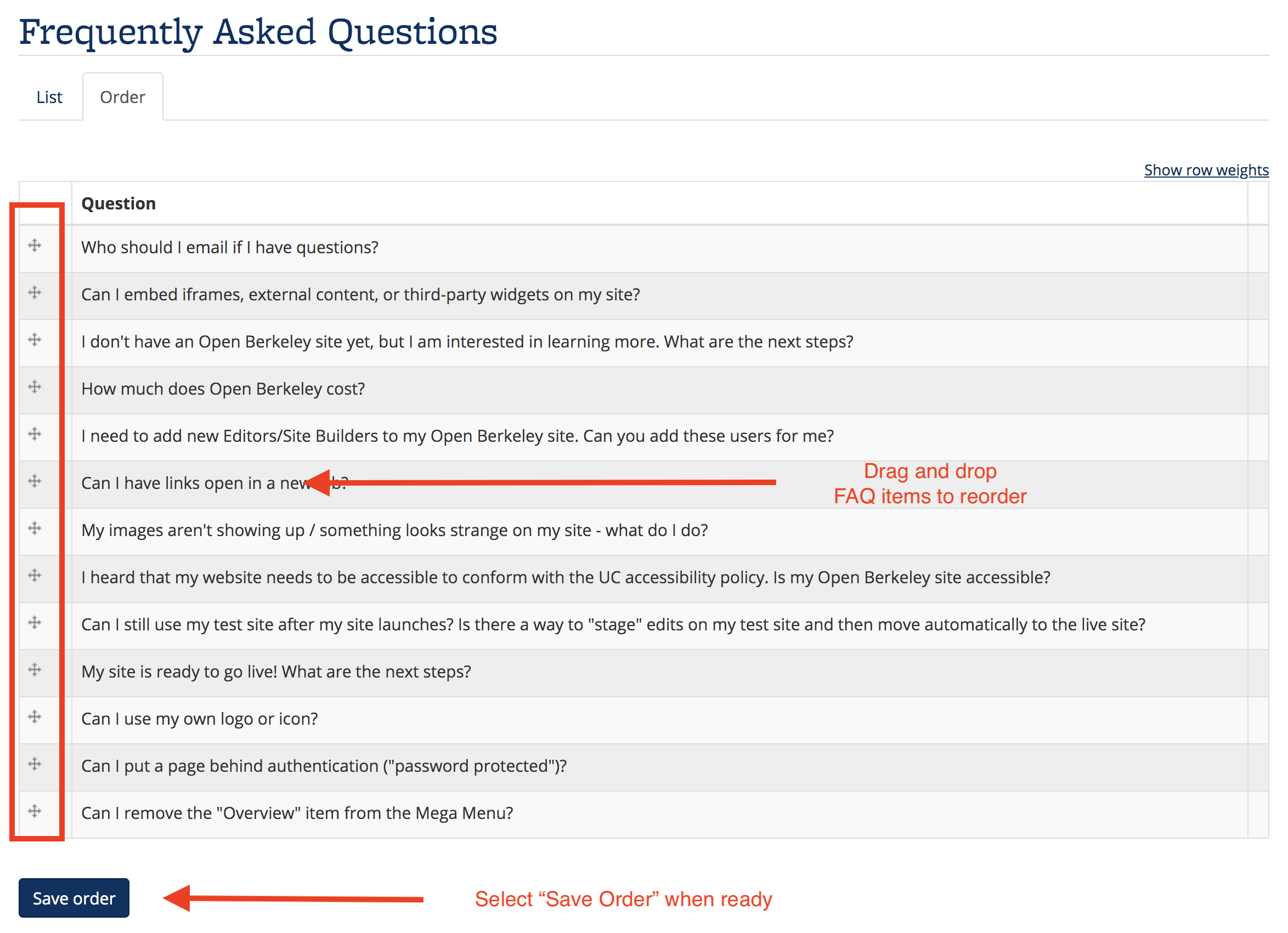 Go to your main FAQ page (http://[yoursite].berkeley.edu/faq-page), then select the "Order" tab. From the drop-down menu, choose the category you would like to re-order, then select the "Search" button. From here, drag and drop the FAQ items, then select the "Save Order" button at the bottom of the page. See Figures 3 and 4, below.